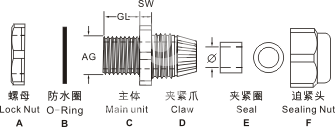 產(chǎn)品材質(zhì):A.C.F部位采用優(yōu)質(zhì)304不銹鋼制成,B.E部位采用丁腈橡膠制成,D部位采用白色尼龍制成。