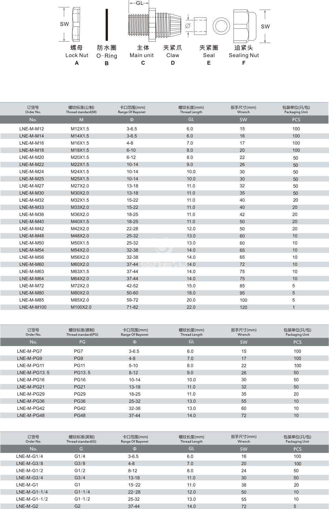 產(chǎn)品特性:特殊夾緊爪與密封件相扣之設計,配合迫緊頭裝配省時便利,夾緊電纜范圍大,抗拉力特強,