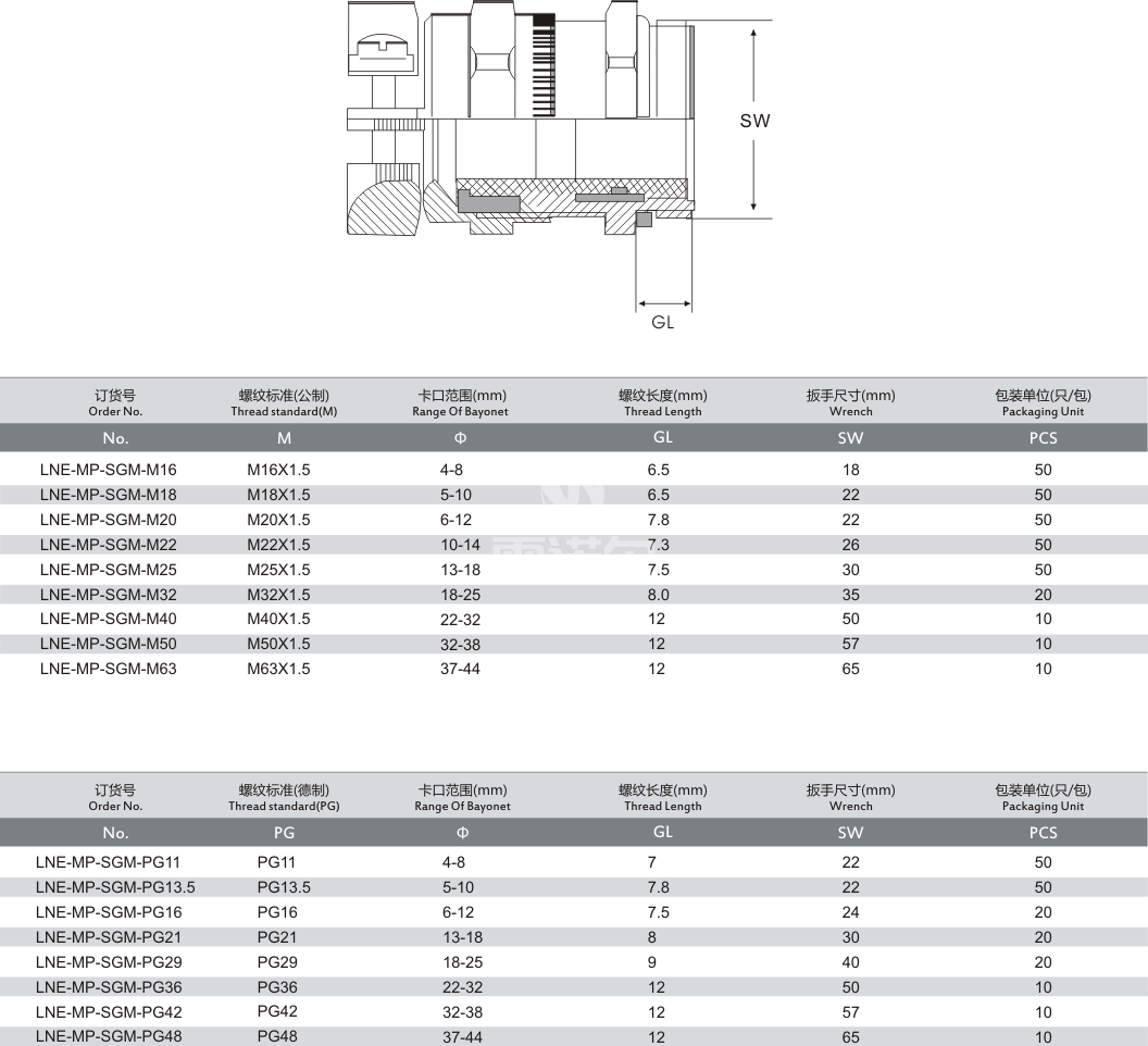 產品特性:特殊夾緊爪與密封件相扣之設計,配合迫緊頭裝配省時便利,夾緊電纜范圍大,抗拉力特強,